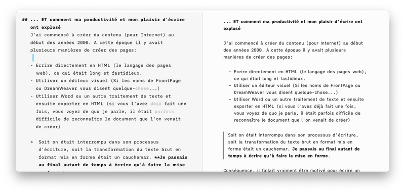 Tout de suite j’ai compris que cet outil était fait pour moi. A l’époque ce n’était encore qu’un script. Immédiatement ce fut le coup de foudre entre nous. Je pouvais me focaliser sur ce que j’étais en train d’écrire et une fois satisfait du résultat, convertir le tout et le mettre en ligne en un seul clic.